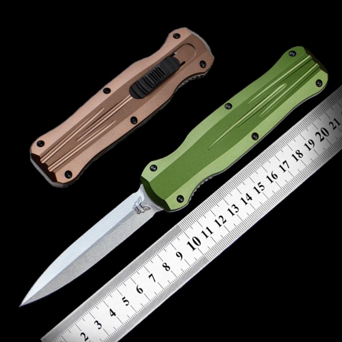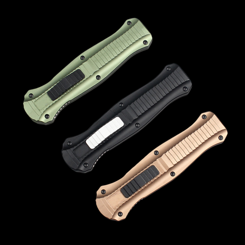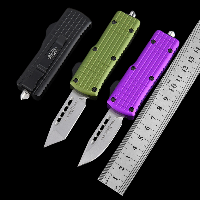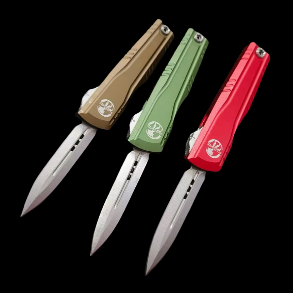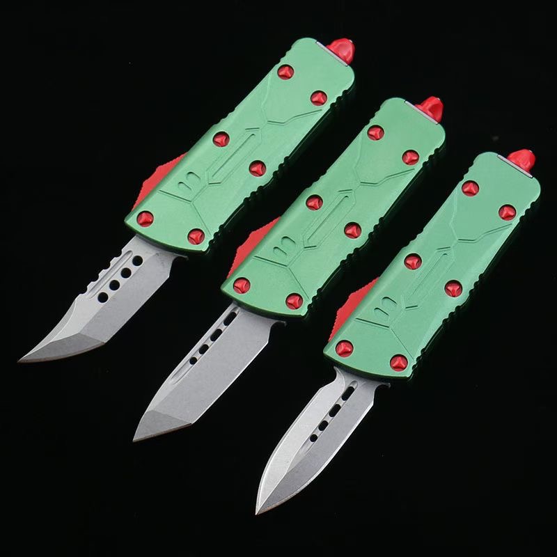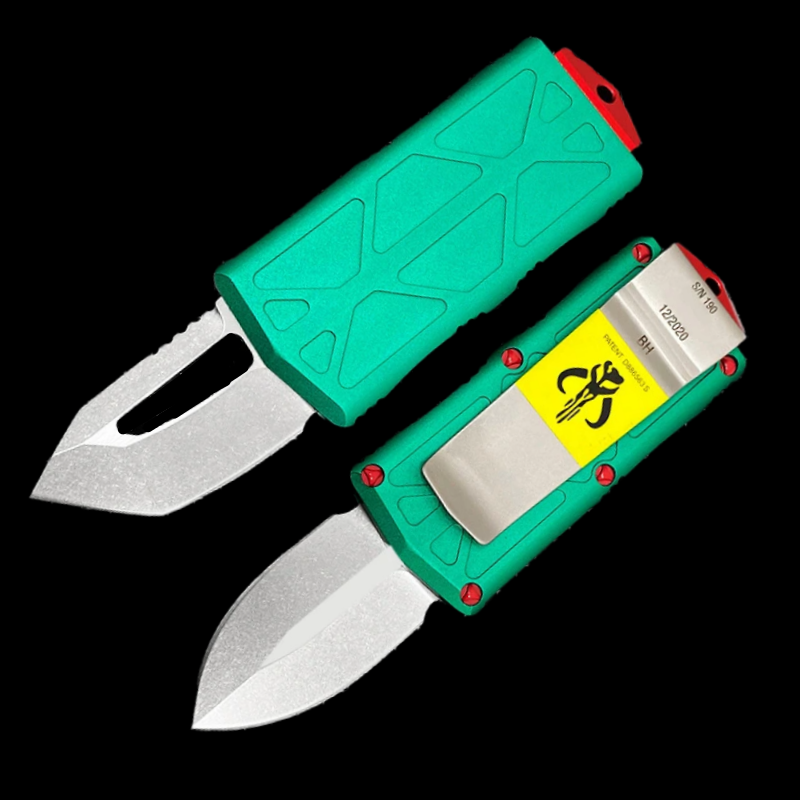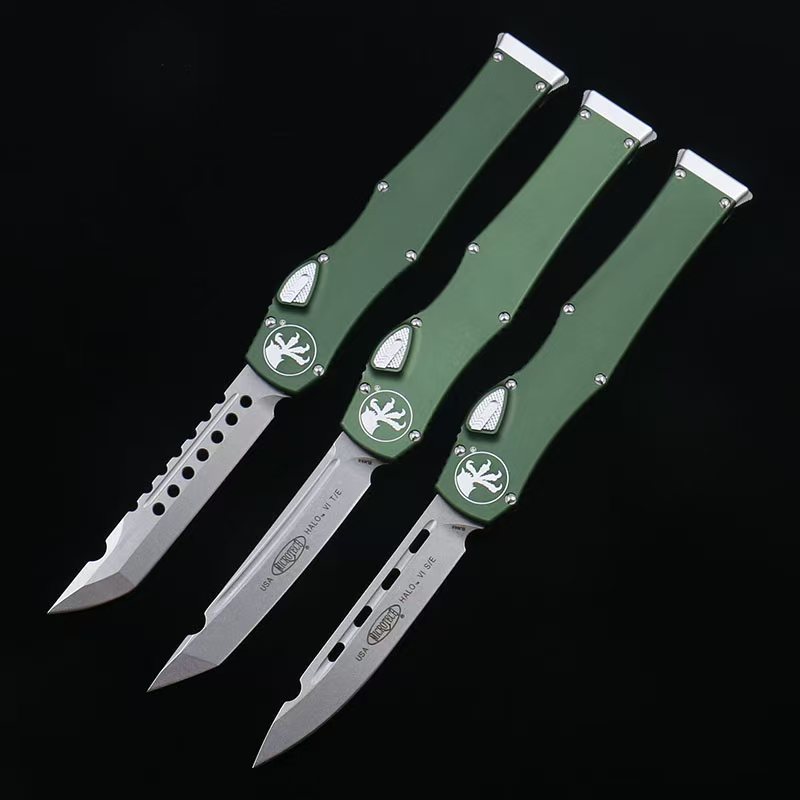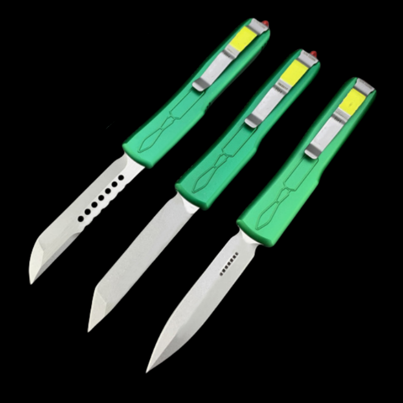 OTF micro-tech green handle Halo 6 lever straight jump knife