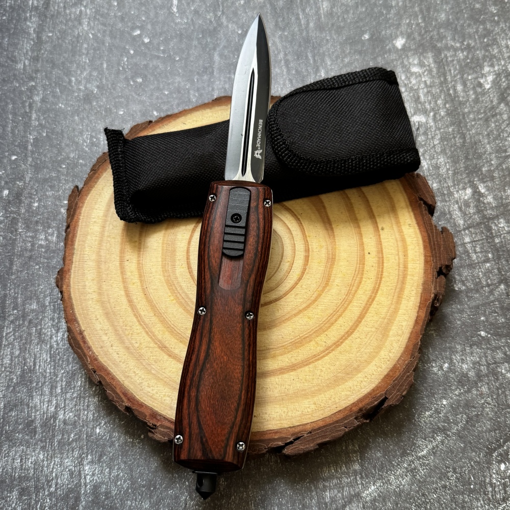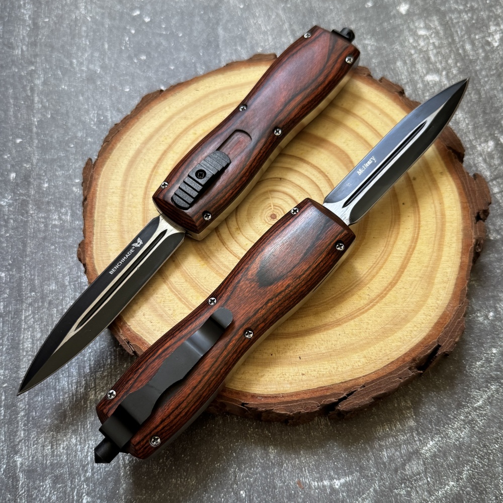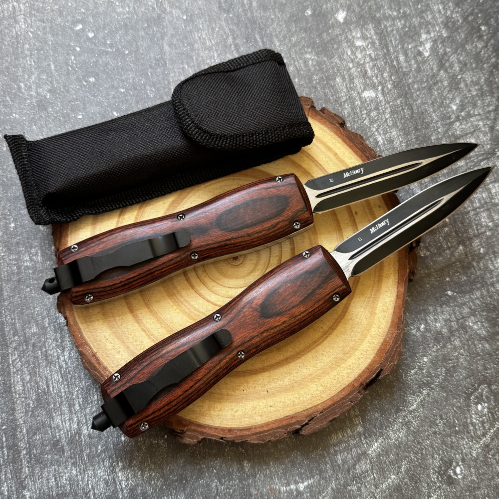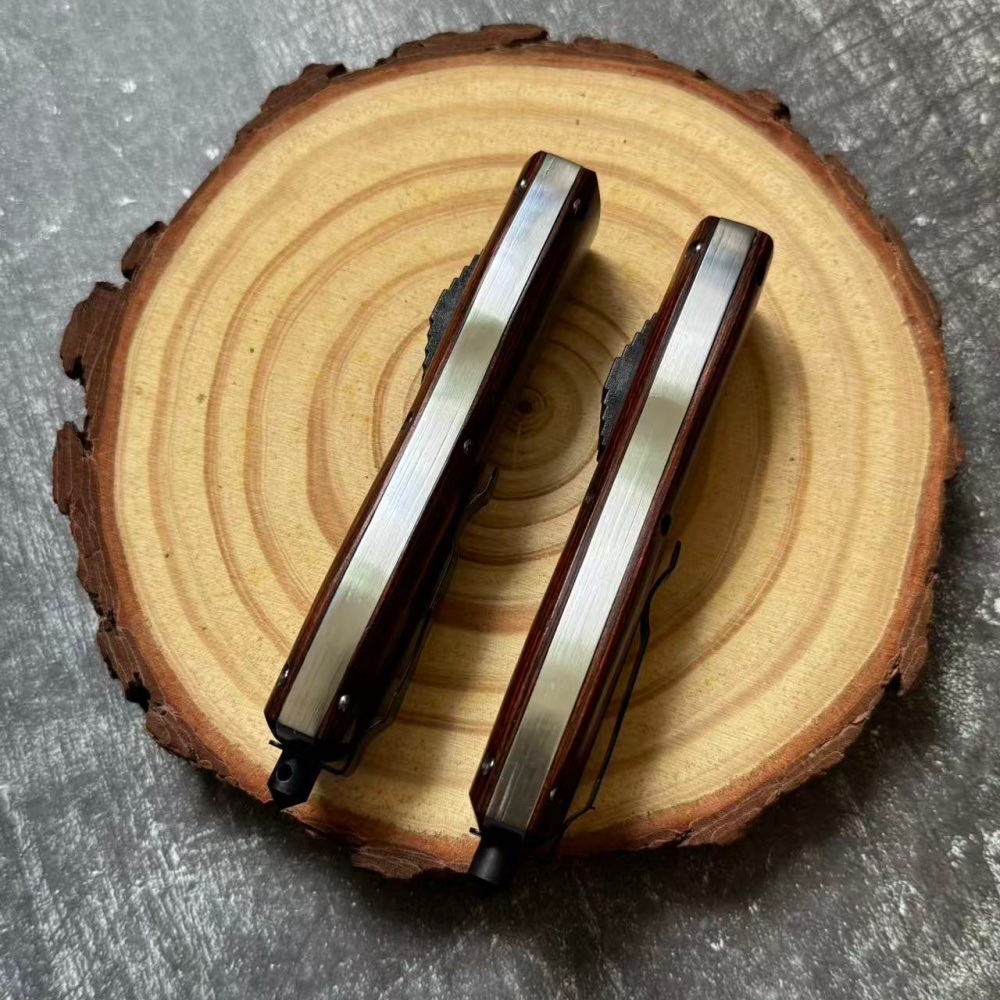 Name: Caimu OTF Hunting Tactical Automatic KnifeTotal length: 229mm/9.02 inchesHandle length: 130mm/5.12 inchesBlade length: 97mm/3.82 inchesBlade thickness: 2mm/0.08 inchesBlade material: D2 steelHardness: 58-59HRCBlade weight: 204gHandle material: RosewoodSheath: Nylon sheath