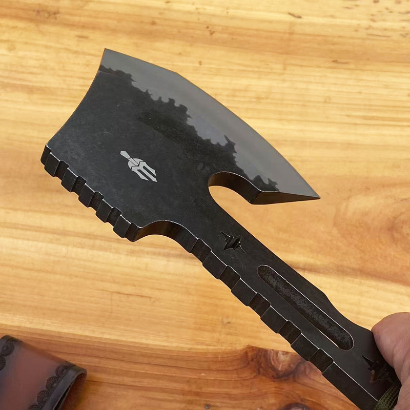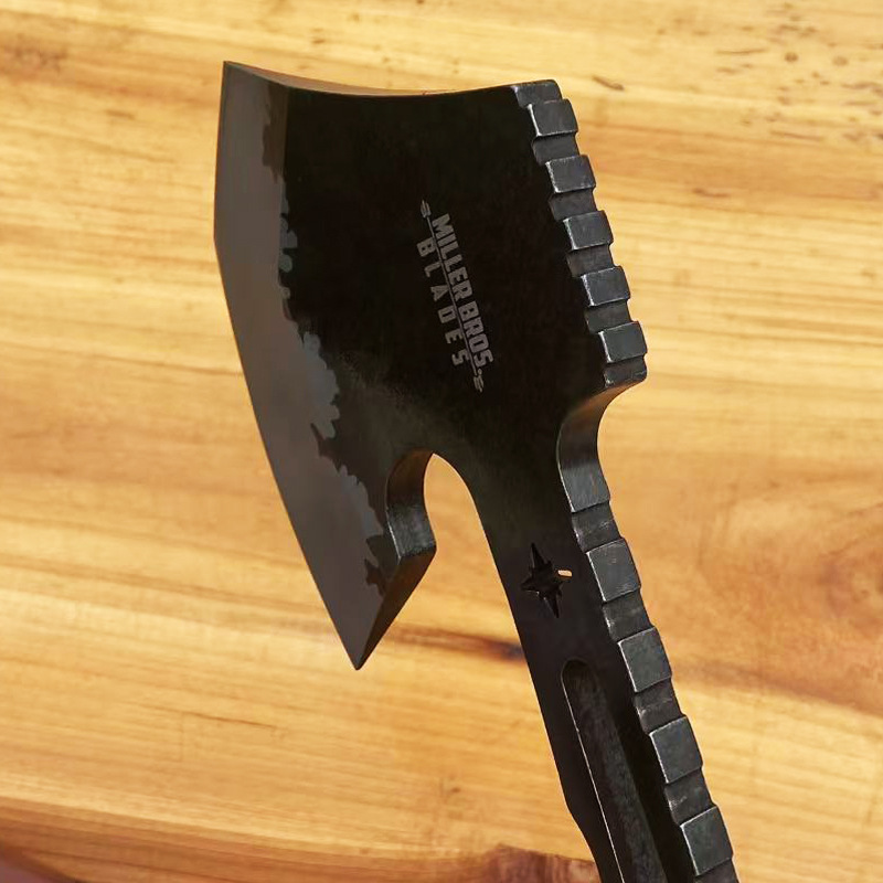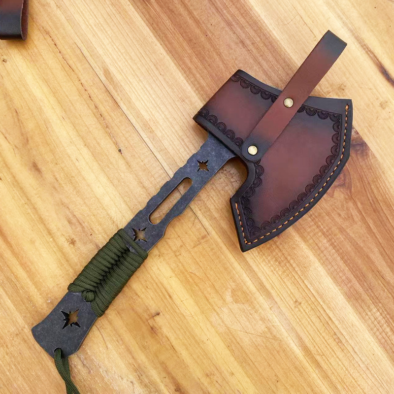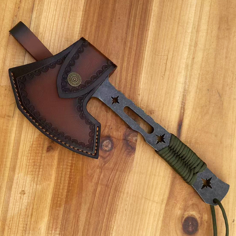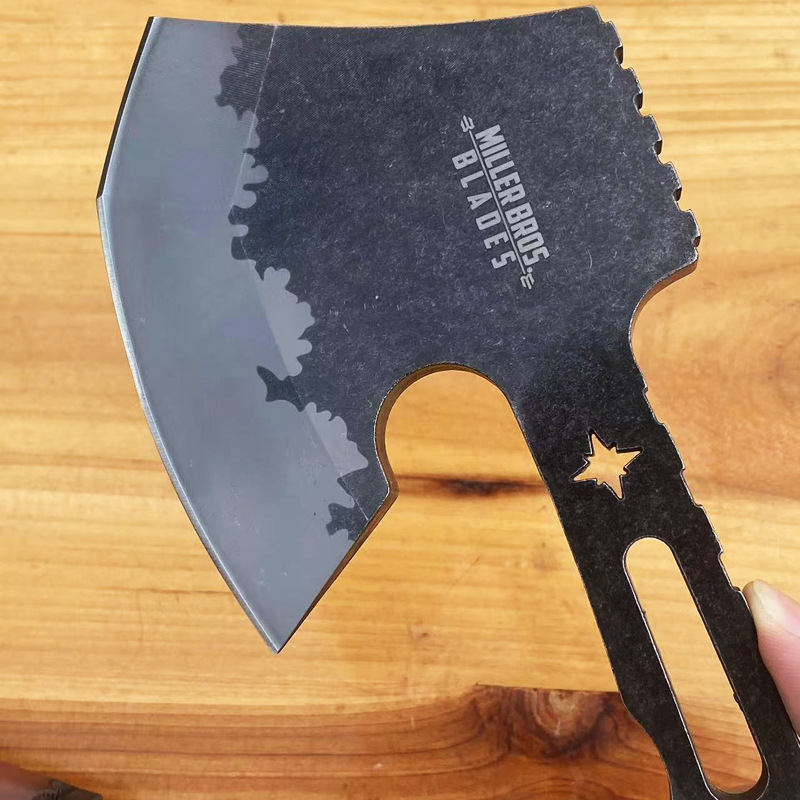 Product Name: Miller TomahawkOverall Length: 300mm / 11.81 inchesBlade Length: 125mm / 4.92 inchesHandle Length: 175mm / 6.89 inchesBlade Width: 100mm / 3.94 inchesBlade Thickness: 10mm / 0.39 inchesBlade Material: M390 SteelWeight: 700gHardness: 59-60 HRCSheath: Leather